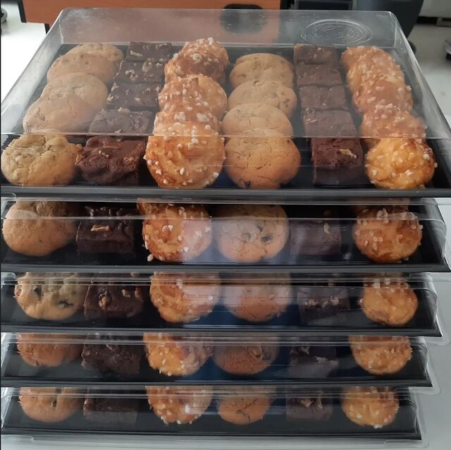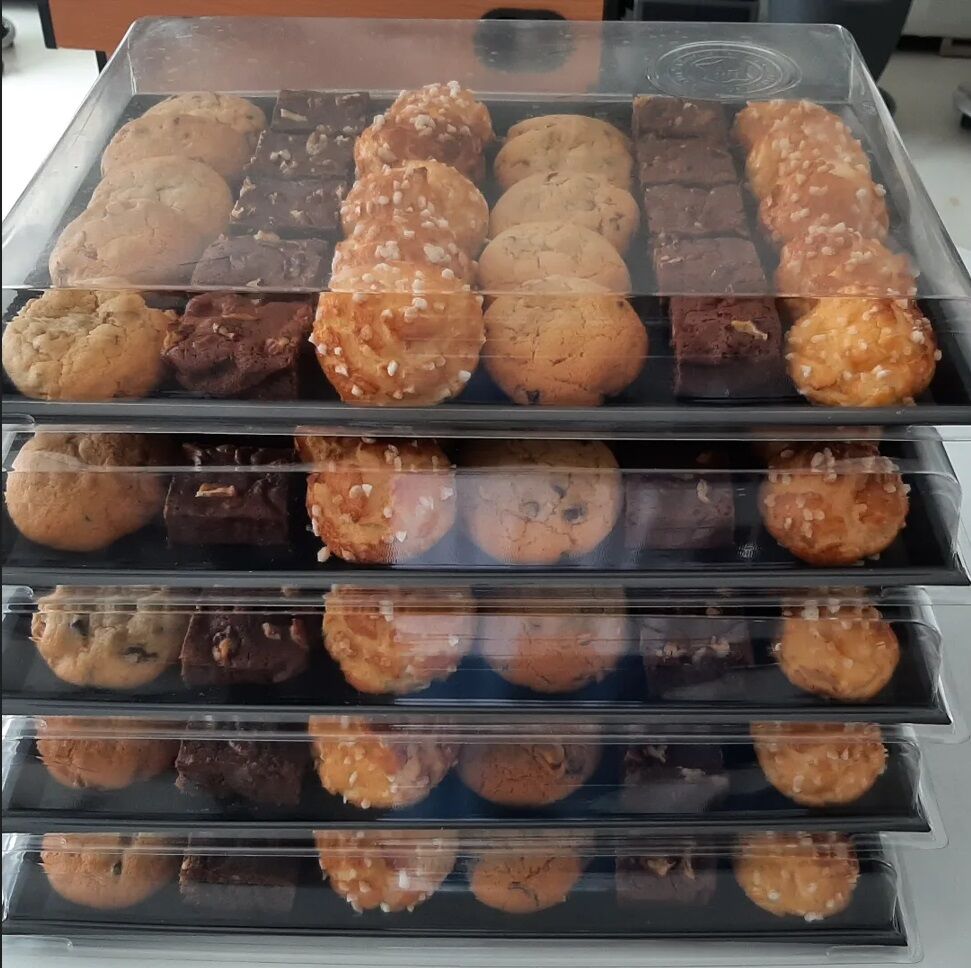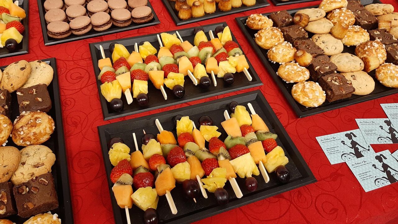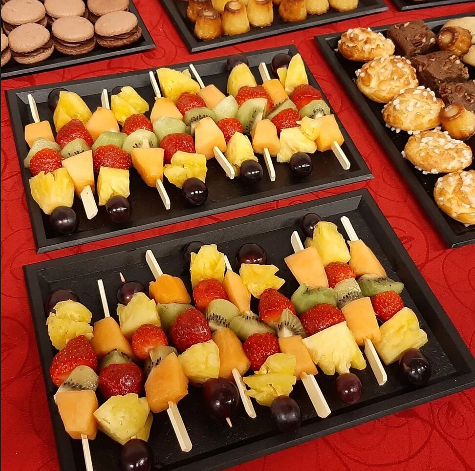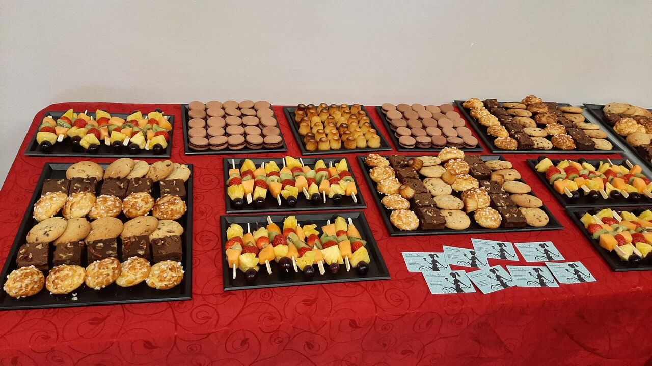 Voici une commande de goûter pour 50 personnes comprenant des chouquettes, brownies aux noix de pécan, cookies aux pépites de chocolat, macarons au chocolat, brochettes de fruits et des cannelés.